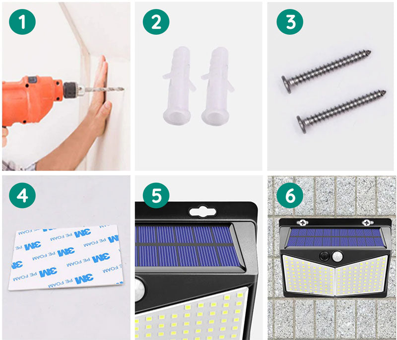 Our wireless solar security lights can be quickly mounted using the included screws, expansion pillar hinges, mounting tape, a thin wire, or your own inventive methods.