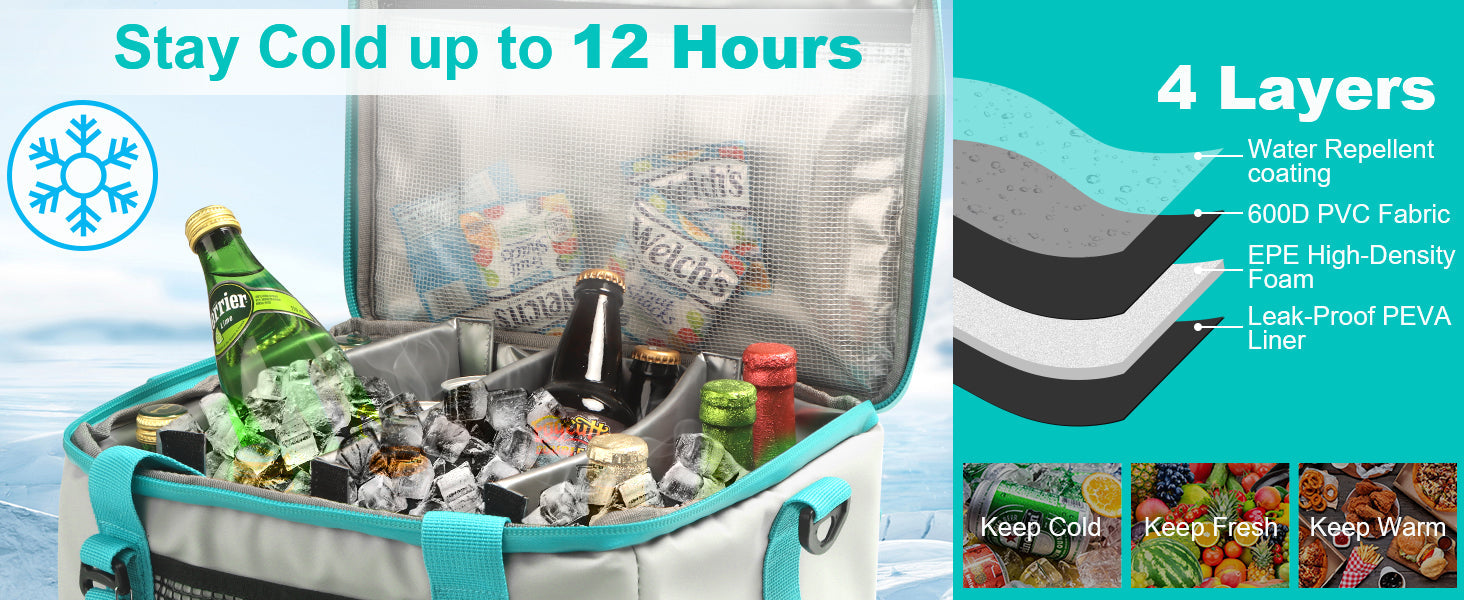 Featuring advanced high-density insulation, this cooler bag keeps your food and drinks icy cold for an incredible 12 hours. Its innovative four-layer construction, with a leak-proof lining and water-resistant exterior, ensures everything stays fresh and dry no matter where your adventure takes you.